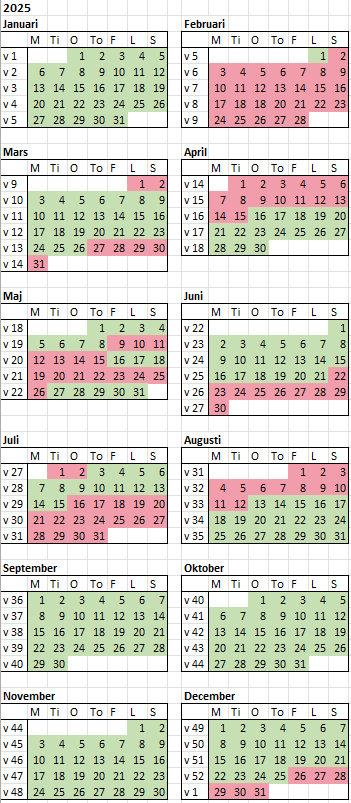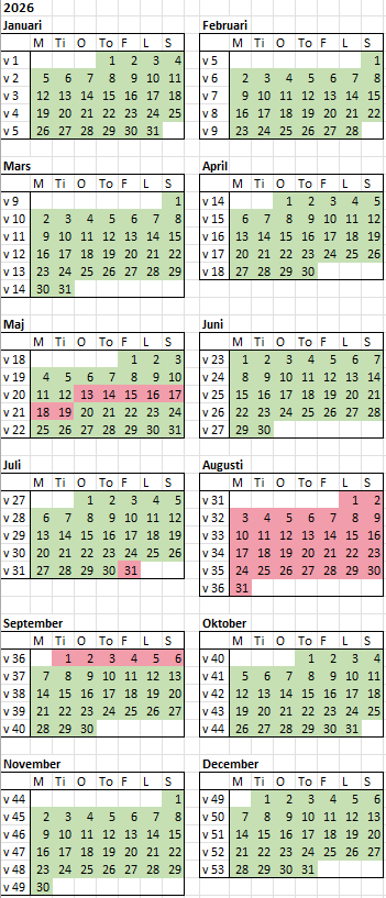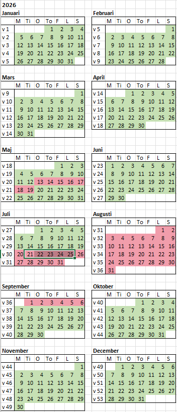 Här syns en kalender över vilka dagar som radhuset är ledigt respektive upptaget. Alla gröna dagar är huset ledigt och alla röda dagar är det upptaget.